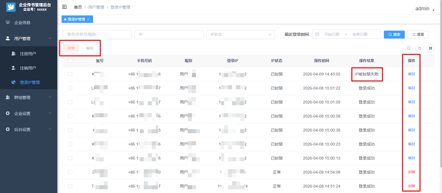 在左侧菜单的 用户管理>登录IP管理 里,可以 勾选多条登录记录 或 直接针对单个登录记录进行 封禁IP的操作